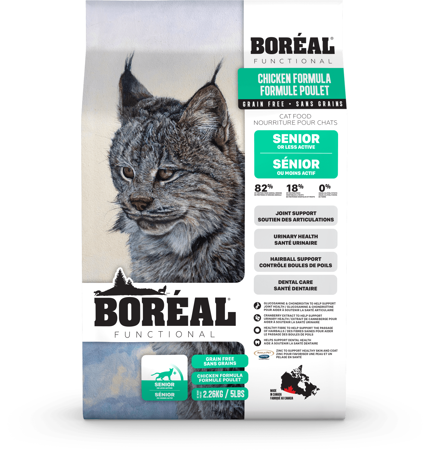 Ease up the life of your less active or elderly feline. Our Boréal Functional Senior and less Active cat have been specifically formulated to reduce their health issues and keep them happy at feeding times. With fresh deboned chicken being the first ingredient sourced from Canadian farms you’ll be providing them a rich easy to digest meat that’s full of Glucosamine, a powerful amino acid that supports their joint and bone structure.